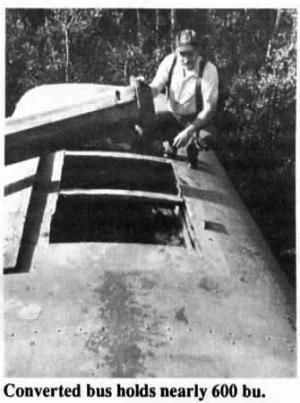 Rogers started with a 1974 Chevrolet C-50 school bus equipped with a 350 cu. in. engine and 5-speed transmission. He stripped out the seats and cut a 3-ft. wide, 7 ft. long hole in the roof. He cut three 10-in. sq. dump holes 5 ft. apart in the floor and covered them with slide chutes equipped with grab handles. He constructed a 4-ft. high retaining wall behind the driver's seat by bolting 2 by 6 planks to a pair of metal uprights. Rogers uses the bus to unload bins or to load out combines in the field.