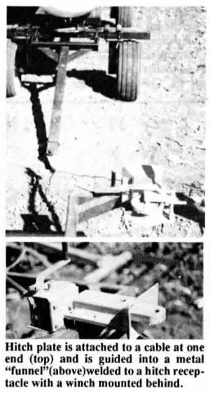 The coupler consists of a pear-shaped hitch plate that's attached to a cable at one end. The hitch plate is guided into a metal "funnel" which is welded to a rectangular hitch receptacle with a hand-cranked (or electric-powered) winch mounted behind.