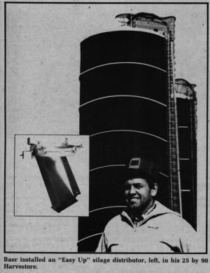 Baer says his Harvestore dealer is skeptical about the Easy-Up spreading method, apparently concerned that it will prevent a cone from forming over the unloader. Baer, however, is satisfied it works. He uses it in both of his Harvestores and has had no problems in nearly two years of use, servicing his 350-cow herd. "Another important benefit is that we are able to put 10 to 15 more tons of haylage into the silos because it packs in better."