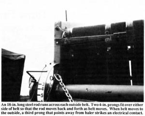 The monitor consists of a pair of 18-in. long steel rods that run across each outside belt. Each rod is fitted with two 4-in. prongs welded to it at right angles. The prongs are spaced to fit over either side of the belt so that as the belt moves back and forth, the prongs move the rod, which is held loosely by its mounting brackets. A third 8-in. long prong mounts at the outside end of each rod, pointing away from the baler. When the belt and rod moves toward the outside, indicating that side of the bale needs more hay, the 8-in. prong contacts a bare galvanized 6-in. length of wire. The contact completes a circuit and causes one of two green lights on the monitor in the cab to flash, indicating that the baler needs to be moved either left or right.