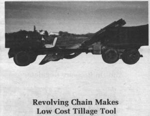 Generally, a large chain is towed in a big loop behind a field cultivator or other implement. Some farmers, with big fields to cover, simply run up to 100 yards of revolving chain between two tractors. A special hookup attachment at each end of the chain ù made of used car or truck wheel hubs ù allows it to revolve as it's pulled forward. To get more aggressive revolving action, an 8 to 7 ft. long section of spikes can be welded to the chain in the middle area to make it revolve faster. These spikes should protrude beyond the link for about 2 in.