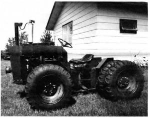 Rudebusch narrowed up two Ford car rear axles to 30 in. and positioned the front axle to face backward. He used 3/ 16-in. sheet metal to build a box frame around the rear axle's differential and mounted dual 15-in. lugged swather tires on each axle. He powered the tractor with a 2-cyl. 16-hp Wisconsin gas engine and a 3-speed Ford car transmission.