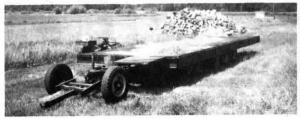 To build the trailer Godbout bought a tongue and triple axles designed for a mobile home. He cut and widened the axles, then used 6 by 6-in. I-beams to build a frame which he covered with wooden planks. Godbout also uses the trailer to retrieve round bales from the field. He pulls the trailer with a ball hitch on the tractor drawbar. He sets the front end of the trailer on the ground while loading bales with the tractor, then hooks up to the trailer again for transport, all without leaving the tractor seat. He also pulls the trailer behind a pickup to trans-port equipment.