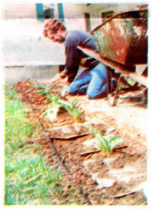 Gogerty simply spreads the paper around newly planted flowers, tomato plants and any place else he wants to stop weeds, and then covers the paper with an inch or so of soil. The paper keeps weeds from sprouting for several weeks, just like a plastic mulch barrier. Unlike plastic, however, it still lets moisture through and eventually disintegrates in the soil leaving no harmful residue. It gives plants a chance to get a head start on weeds.