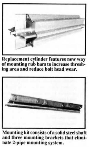 Designed for N & R Series Gleaners ($3,600), Deere 8820 ($1,975) and Deere 7720, 9600, and 9500, Massey Ferguson, and Claas (prices available upon request), the replacement cylinders feature a new way of mounting rub bars that increases threshing area and reduces bolt head wear.