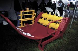 It consists of a curved steel cradle with a pair of beaters at one end that are chain-driven by a hydraulic motor. Extending a hydraulic cylinder raises the cradle to feed the bale into the beaters, which rotate the bale and also peel hay off at the same time. As the bale gets smaller, the operator continues to raise the cradle as necessary.