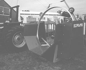 The 3-pt. mounted wrapper eliminates the need for a separate bale cradle, engine, pumps, hydraulic cylinders, axle, and tires used on conventional tube wrappers. In-stead, a front-end loader is used to hold the bale in place as you drive the tractor-mounted wrapper ahead. The wrapper itself is powered by a hydraulic motor that runs on tractor hydraulics. The unit swings be-hind the tractor for transport.