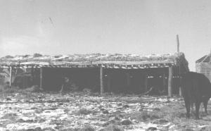 He put a row of large poles down the center and along either side, and then laid smaller dia. tree trunks at an angle from the sides to a center board at center. Then he laid a layer of square bales of cornstalks across the en-tire roof of the shelter. He closed in the back wall of the shelter with a couple rows of round stalk bales.