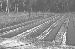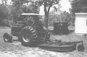 I used a 3-pt. off an old disk and tubing and pipe to build the 5-ft. by 5-ft. frame. The plastic-holding wheels are two 20-in. dia. tires off an old yard cart, while the 18-in. dia. disk blades, which throw dirt onto the edge of the plastic, were given to me by my neighbor. The wheels are adjustable on the pipe axle so I can use either 48 or 54-in. wide plastic. Downpressure on the disks, which mount in vertical shafts, is adjusted with the 3-pt. to throw more or less soil.