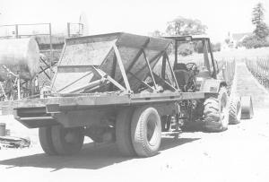 "The box is made from plywood mounted on a metal frame. The hopper hinges on a metal frame. The hopper is built at an angle and hinged so it reaches far out past the edge of the flatbed. Two hydraulic cylinders do the dumping."
