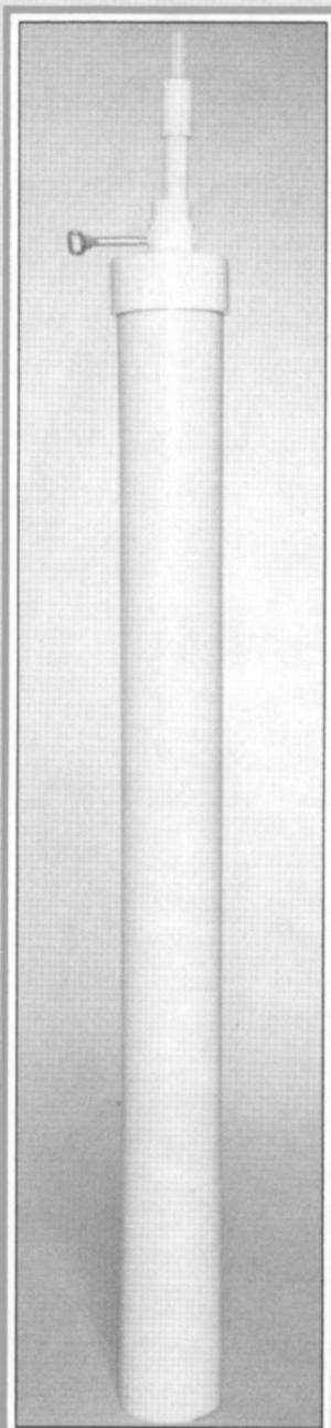 The Water Monitor consists of a plastic float mechanism housed inside a 4 1/2-ft. length of 4-in. dia. PVC pipe. It bolts onto a corner of a stall with two U-bolts and connects to any ordinary 3/4-in. dia. garden hose, which runs in at the top. Water level adjustments are made with a plastic bolt on top.