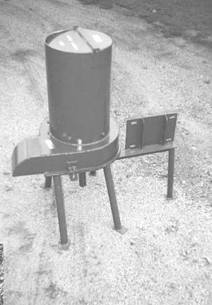 Your readers may be interested in this oneof-a-kind "chicken grinder" that shreds birds in about 30 seconds. Developed in the mid 1970's by Walter Ahrens of Winthrop, Minn., it provides an inexpensive way for large poultry producers to dispose of dead birds without having to incinerate them or wait for a rendering truck. My partner and I are in the process of purchasing Ahrens' manufacturing business. The unit shreds laying hens up to 7 lbs. and can also be used on baby pigs up to 2 weeks old. It's powered by a 5 hp electric motor (not included) that bolts onto a steel bracket. The unit works on centrifugal force and uses steel fingers to do the shredding inside the 1-ft. dia. steel cylinder.