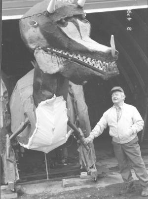 The dinosaur has teeth made out of swather cutterbar sections and Steichen sprays water out its nose using an air compressor and hose. A tape recording of "wild beast" sounds playing inside the dinosaur completes the illusion. When unveiled recently, Steichen had a person dress up like a lion tamer to "tame" the creature.