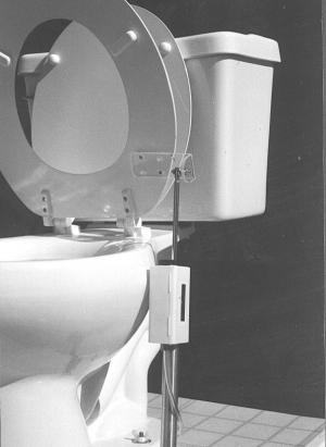 "It works off pressure in the lines, which is typically about 40 psi," explains inventor Joseph Denys of St. Clair Shores, Mich. "A sensor mounts along the side of the toilet bowl and connects to a small hydraulic cylinder, with one end attached to an arm on the toilet seat. The sensor senses the drop in water pressure in the water inlet to the toilet tank when the toilet's flushed. This activates the cylinder's ram, which lowers the seat."