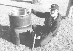 The tub came out of a Speed Queen wringer-type washing machine. A lip around the top of the tub fits over the top of the open barrel. At the bottom of the barrel he cut out two doors on opposite sides. Each door is se-cured by a hook to the barrel and can be slid sideways in order to adjust air flow inside the barrel. He also cut out a series of holes around the drum's upper portion to provide a draft for the fire.