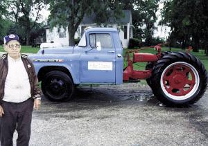 It consists of the back half of a 1940's Farmall H tractor and the front half of a 1960's Chevrolet 2-ton truck.