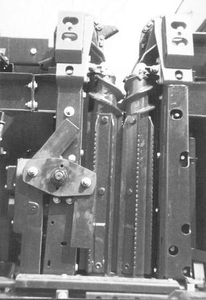 The "Harvestec" corn head, imported from Europe, quick-taches to most popular combine brands. The head is equipped with rotary chopping knives, one set for each row, that operate together with the snapping rolls and are positioned just below them. The head is also fitted with an electrically-controlled snapping plate adjustment that allows you to control spacing of the snapping plates right from the cab.