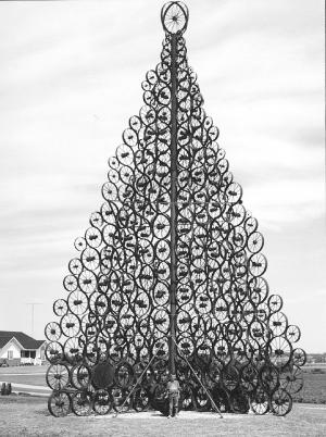 To make sure the tree would stand up to the elements, Schmerse first poured a 4 1/2-ft. thick concrete footing to anchor the tree trunk in. The trunk is made from 8-in. dia. well casing sunk in the center of the footing. Four steel plates extend out on top of the concrete from the trunk in a cross shape to serve as bases for the 30 ft. wide sides of the tree. Schmerse used 15 different sizes of wheels- mostly wagon and threshing machine wheels - starting with the bigger, heavier threshing machine wheels on the bottom two rows and working up to smaller ones on top.