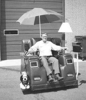 It's equipped with a radio and tape deck with speakers mounted on the upper arms, a TV, lamp and telephone on the driver's left side and a magazine rack on the bottom of the driver's right side. A stuffed dog below the arm rest can be snapped off to be dry cleaned. A multi-colored umbrella mounted on back of the chair protects the driver and vinyl from sun and rain.