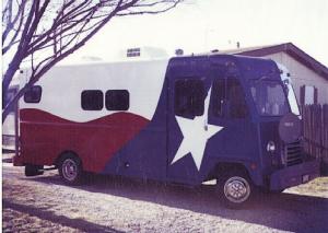 I converted a 26-ft. bread delivery truck into a motorhome complete with an "apartment" in front and a shop area in back. I use it to run my mobile repair business. The truck is painted red, white, and blue and has a big white star on both sides to make it look like the state flag of Texas. The shop area includes air and electric-powered tools, toolboxes, an air compressor, and equipment for plumbing, appliances, electrical work, etc.