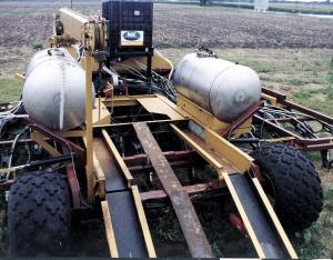 Scheetz has set a goal of raising 300 bu. per acre corn next year, which requires a lot of nitrogen fertilizer. To accomplish this he's equipped the planter to convert anhydrous ammonia into liquid fertilizer right in the field. A heat exchanger injects anhydrous ammonia into a reactor, along with a water pump which injects water into the reactor. This mixture is then converted into a liquid nitrogen form. The liquid nitrogen is delivered through hoses and injected into the ground 1 1/2 in. off to the side and 3 in. below the seed openers. Redball monitors let him keep an eye on the amount of fertilizer going to each row.