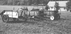 All of this company's models are ground-driven. They're available with either steel or rubber wheels and can be pulled by either horses or tractors. They come with an orange plastic box and an auto steering front axle. Capacities range from 30 to 75 bu.