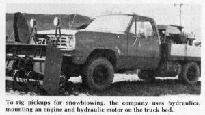 To power snow blowers frontmounted on pickups, the company mounts a 383 Chrysler engine and hydraulic motor in the truck box, then runs hydraulic lines to the blower up front. "You can mount a blower as large as 8 ft. on a 3/4 ton truck and, if desired, run it off a drive shaft rather than hydraulics," says Calabrese. Cost for the auxiliary engine, hydraulics and snow blower for pickups is right at $6,500.