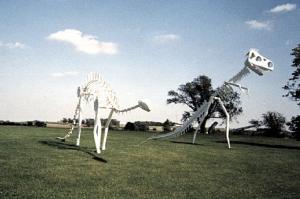 Here's a photo of two full-size dinosaurs that we made for a friend of ours. Each dinosaur's spine is made from trencher chain and the legs are made from street light poles. One dinosaur is 50 ft. long and the other is 24 ft. tall. They stand along Hwy. 2, 3 1/2 miles east of Corydon, Iowa. (Dean Kenney, 2392 180th St., Allerton, Iowa 50008)