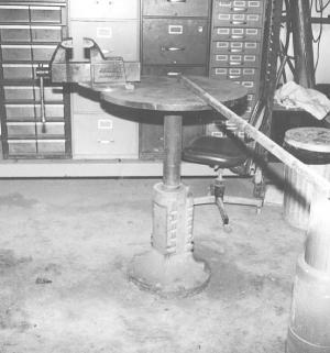 "I used the axle housing from one side of a Deere tractor to make a handy and portable work bench. The axle housing serves as the base. I welded a round piece of 1-in. thick steel plate to the bearings on top of the axle. I bolted a vise onto one side of the table and use it to ælock' an object in place, such as a length of angle iron, so that I can cut it. Works great when used together with my TV dolly. The round plate spins freely and will automatically line the vise up with the dolly.