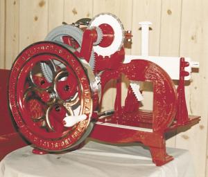 Here's a photograph of an antique meat slicer which I have restored. When I found the slicer at a sale, it was very rusty and all moving parts were seized. I sandblasted all parts and soaked the chain in WD-40. I chromed the flywheel and other parts. There's no stainless steel in this slicer. Just a lot of cast iron and steel. It has a sliding table which slides at the turn of the wheel. It'll do everything from shaving thin slices to cutting big chunks. On the front of the wheel are these words: "Sterling Slicer, No. 90, N.R. Streeter & Co., Rochester, N.Y. Patented 1908". (Ted Fiforowich, 18 Henderson Dr., Yorkton, Sask. S3N 2Z2 Canada)