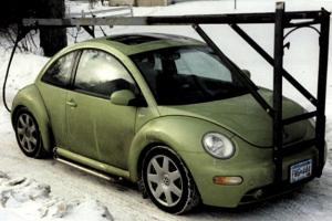 He installed hitches on the front and rear and then welded together a roof rack that fits on the hitches. The rack lets him carry ladders, plywood, and other equipment on top of the car. The rear supports on the rack curve outward so he can still get into the trunk (unlike the original beetle, the new VW's have the engine in front).