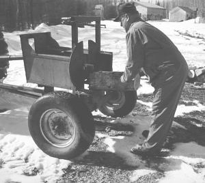 The La Crete, Alberta, farmer stripped off the hay pick up, knotters and needles, and then cut off the bale chamber just behind the axle. He stripped out the insides of the bale chamber, too, taking off the plunger, but leaving the crank in place. What remained was the PTO drive, the flywheel, part of the bale chamber, and the axle.
