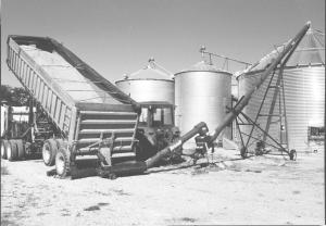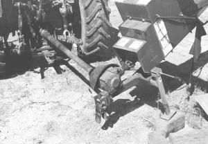 The addition of the gearbox allows the tractor to pto-drive the auger at a right angle, which leaves room for the semi trailer to pull in alongside the tractor. After parking the trailer, Jacobs pulls the swing-away unit into place behind the truck.