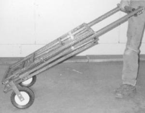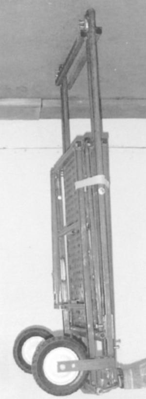 The "Lee Unlimited Power Bench" consists of a drop center table with two heavy duty wings supported by adjustable folding legs. The bench is adjustable in height from 28 to 40 in. and measures 2 ft. wide by 9 ft. long. The entire unit folds up to just 6 in. wide and 56 long. A pair of wheels lets you roll it around like a 2-wheeled handcart.