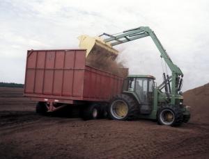 The company built the loader to handle dried peat moss, which can be fluffy and light. It attaches to the front of a Deere 7410, 6410 or Massey 399 tractor and is fitted with a big 5.8 cu. yd. bucket and has a 17-ft. lift height for loading into high-sized trucks.
