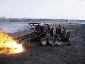 His tractor-mounted burner, built five years ago, is designed so he can control the fuel and air mix from the driver's seat, as well as the direction of the three flame tubes protruding from the back of the machine. With these controls and by adjusting tractor ground speed, he can precisely control the amount of burning in the field. The burner consumes some 25 gal. of diesel fuel an hour. When conditions are right, a good operator can burn off an 80-acre field in about an hour.