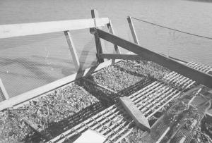 The "floating garden" is an 8 by 20-ft. platform with a bed made out of 6-in. dia. plastic pipes. An 8-in. deep layer of composted leaves covers the bed. Plant roots reach down between the pipes and into the water, giving them a constant supply of moisture. Since there are no weed seeds in the compost there's no need for weeding or herbicides.