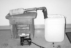 "When foam in the bottle gets heavy enough, it drops out to the ground," Hodgson says. He says they use plastic quart oil containers. If there's too much space between the foam drops on the ground, he says you can shorten the distance by cutting off more of the bottom of the bottle. The size of the mark will be reduced, however.