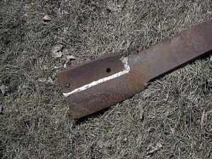 I use my Bush Hog 307 7-ft. rotary mower to cut hay as well as brush and weeds on our farm, which has a lot of big rocks. The blades are made from soft metal and often got chipped or became very dull. If I hit a rock it was often enough to snap the blade in half. To solve the problem I cut a 3 by 2-in. piece off the front part of the blade. Then I cut the same size piece out of a stainless steel plow share and weld it on.