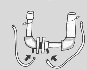 To make the system work, electrical current is passed through the water by attaching a car battery to the electrodes using jumper cables. The current passing through the water produces a chemical reaction that releases small amounts of chlorine gas and ozone. Both gases rise into one end of the U-shaped pipe. A 12-volt DC fish tank aeration pump (the kind used to keep air and water circulating in bait tanks on fishing boats) pulls the gases out of the enclosed PVC pipe to the bottom of the tank of water being treated.