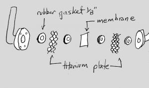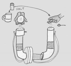 The low-tech water purifier is made of 2 in. PVC pipe, put together in a U shape, with electrodes inserted in the lower portion of the pipe. A semi-permeable membrane between the electrodes separates the water, which has a higher salt concentration on one side.
