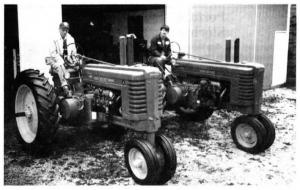 engine was full of water and locked up. I had a 350 diesel engine from a 1979 pickup so, after reading about John's conversion, I contacted him and talked him into doing one for me. It turned out great as the photo shows. I'm on my tractor on the left and John's on his tractor on the right. (George R Thomas, 5878 Hedley Rd., Radnor, Ohio 43066 ph 740 595-3385)