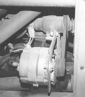 "Instead I replaced the original generator with a 12-volt alternator and mounted a double-grooved pulley on it. I went to a junkyard and found an old Pontiac power steering pump, which I mounted on the opposite side of the tractor using homemade brackets. It drives off the alternator. Then I mounted a Charlin hydraulic motor on the tractor's steering shaft, just in front of the steering wheel. I drilled a hole through the steering shaft and bolted the motor to it. Hydraulic hoses run from the pump to the motor.