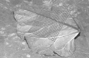 To start, put plastic down on your work surface and then lay out a rhubarb leaf with the veins up. Make sure there are no wrinkles in the plastic and that the leaf lies flat. Next, cut a piece of wire mesh that covers the area of the stone where you'll step. Then mix the concrete with just enough water to make a very dry mix.