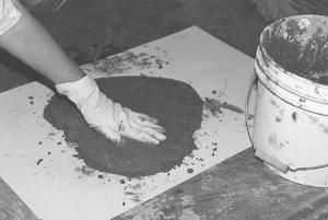 Once you have the leaf spread the way you want it and the concrete mixed to the right thickness, start applying it by hand to the leaf. She recommends leaving about half an inch of leaf sticking out from under the concrete, so the veins run all the way to the edge of the stone. When you've applied about 1 1/2 in. of concrete to the leaf, press in the mesh and then add more concrete, until the stone is 2 1/2 to 3 in. thick.
