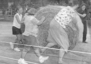 The Farm Olympics consists of seven events. Only one member of each team competes in most of the events. One - the wheelbarrow race - requires a rider and a pusher. And the final event, the big round bale roll, must be completed by all members working together.