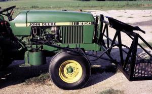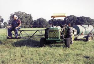 He tried to eliminate the walking by pulling a small spray tank behind his 2150 Deere utility tractor and using a spray wand from the driver's seat.
