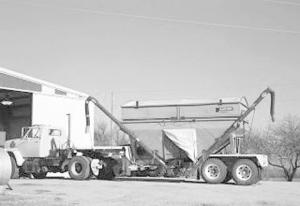 "We bought the 600-bu. wagon at a farm auction and the military trailer at an army base. A local welder mounted the wagon on the trailer and made a partition in the middle so it would hold 300 bu. on each side. Two J&M augers were purchased and attached, one to either side. A new hydraulic pump was installed so we can run the augers separately or together, as needed.