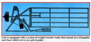 The gate is equipped with a system of weight transfer tanks that mount on a triangular steel base which serves as a pivot point. A system of enclosed rotating shafts extend out to either side of the gate to steel "lift pads". Once you drive a vehicle onto a lift pad, it takes about 5 seconds for the gate to lift up. Fluid flows from a storage tank to a holding tank that holds the gate in the open position. Once you pass through, fluid flows to an auxiliary tank which al-lows the gate to slowly drop back down. Fluid from the auxiliary tank then flows back into the storage tank, the weight of which drops the gate back into a catch bracket.