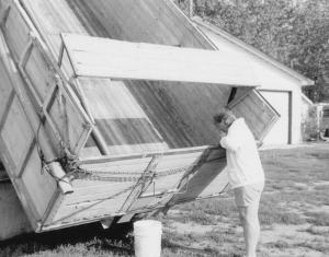 Unloading grain is made more difficult by the need to clean out truck box corners, but a Morinville, Alberta farmer has made the task a lot easier. He altered his truck box endgate so that it's no problem to reach in while standing at the back of the box to scrape out the corners.